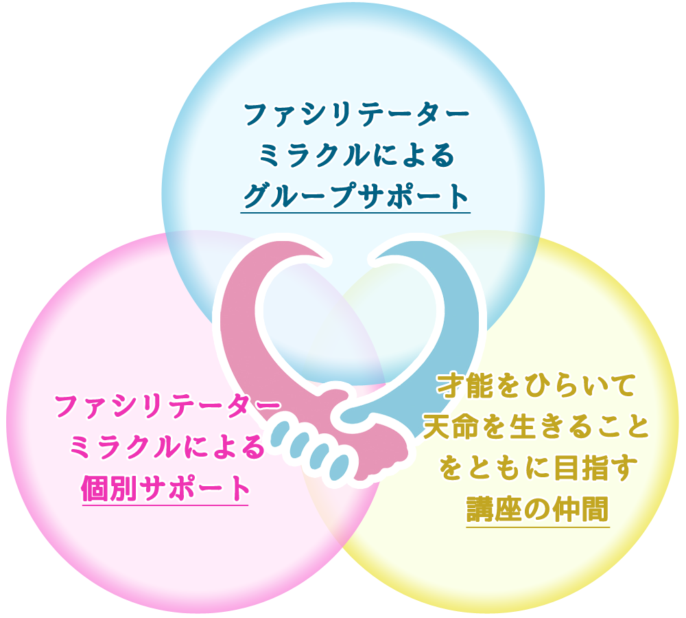 - 3カ月間、24時間 Facebookで講師ミラクルと繋がれることにより随時浮かんだ質問や悩みを相談できる