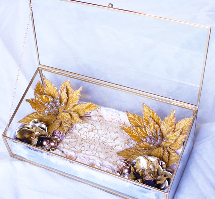 製作者の えしまさんによると、アクリルケースではエネルギーが弱く、かといってガラスなら何でも良いわけはなく・・・豊かさを循環させるエネルギーを持つガラスケースを探していたところ、ステンドグラス職人さんと出会い、オリジナルケースの制作が実現したのです。