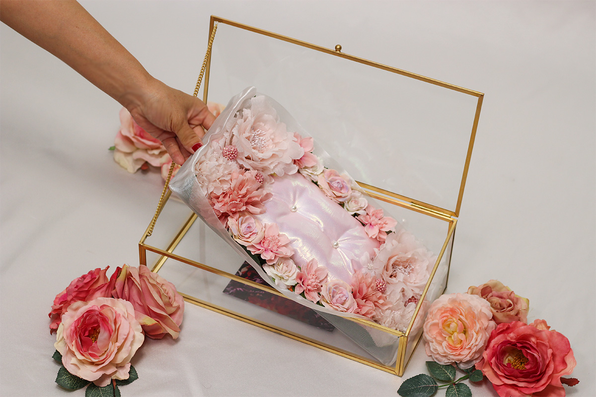 お財布ベッドに使われるフラワーを選ぶ基準は本物の花と同じ、もしくはそれ以上のクオリティ、というだけではなく十分な強度、毛羽立ちやヨレがないか?など細部まで1つ1つチェックしています。